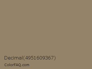Decimal 4951609367 Color is a normal orange color and the nearest color is Arrowtown #948771. Hex code #958369 and RGB value is rgb(149,131,105). In RGB color space, this color is composed of 58% red, 51% green, 41% blue, In CMYK color space, this color is composed of 0% cyan, 12% magenta, 30% yellow , 42% black , In HSL color space, this color has a hue angle of 35° , 17% saturation and 50% lightness.