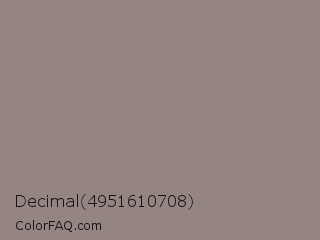 Decimal 4951610708 Color is a normal red color and the nearest color is Cinereous #98817b. Hex code #958582 and RGB value is rgb(149,133,130). In RGB color space, this color is composed of 58% red, 52% green, 51% blue, In CMYK color space, this color is composed of 0% cyan, 11% magenta, 13% yellow , 42% black , In HSL color space, this color has a hue angle of 9° , 8% saturation and 55% lightness.