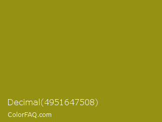 Decimal 4951647508 Color is a normal yellow color and the nearest color is Dark Yellow #9b870c. Hex code #959112 and RGB value is rgb(149,145,18). In RGB color space, this color is composed of 58% red, 57% green, 7% blue, In CMYK color space, this color is composed of 0% cyan, 3% magenta, 88% yellow , 42% black , In HSL color space, this color has a hue angle of 58° , 78% saturation and 33% lightness.