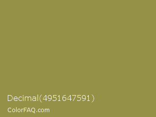 Decimal 4951647591 Color is a normal yellow color and the nearest color is Sycamore #908d39. Hex code #959147 and RGB value is rgb(149,145,71). In RGB color space, this color is composed of 58% red, 57% green, 28% blue, In CMYK color space, this color is composed of 0% cyan, 3% magenta, 52% yellow , 42% black , In HSL color space, this color has a hue angle of 57° , 35% saturation and 43% lightness.