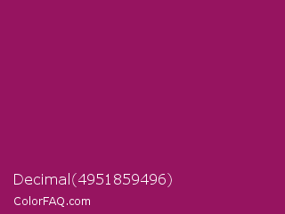 Decimal 4951859496 Color is a normal magenta color and the nearest color is Jazzberry Jam #a50b5e. Hex code #961460 and RGB value is rgb(150,20,96). In RGB color space, this color is composed of 59% red, 8% green, 38% blue, In CMYK color space, this color is composed of 0% cyan, 87% magenta, 36% yellow , 41% black , In HSL color space, this color has a hue angle of 325° , 76% saturation and 33% lightness.
