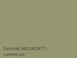 Decimal 4952462977 Color is a normal yellow color and the nearest color is Gurkha #9a9577. Hex code #969771 and RGB value is rgb(150,151,113). In RGB color space, this color is composed of 59% red, 59% green, 44% blue, In CMYK color space, this color is composed of 1% cyan, 0% magenta, 25% yellow , 41% black , In HSL color space, this color has a hue angle of 62° , 15% saturation and 52% lightness.