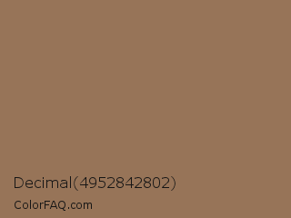 Decimal 4952842802 Color is a normal orange color and the nearest color is Liver Chestnut #987456. Hex code #977458 and RGB value is rgb(151,116,88). In RGB color space, this color is composed of 59% red, 45% green, 35% blue, In CMYK color space, this color is composed of 0% cyan, 23% magenta, 42% yellow , 41% black , In HSL color space, this color has a hue angle of 27° , 26% saturation and 47% lightness.