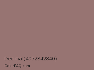 Decimal 4952842840 Color is a normal red color and the nearest color is Hemp #907874. Hex code #977472 and RGB value is rgb(151,116,114). In RGB color space, this color is composed of 59% red, 45% green, 45% blue, In CMYK color space, this color is composed of 0% cyan, 23% magenta, 25% yellow , 41% black , In HSL color space, this color has a hue angle of 3° , 15% saturation and 52% lightness.