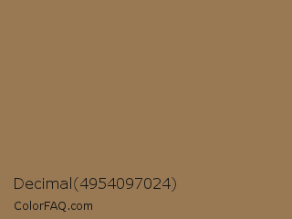 Decimal 4954097024 Color is a normal orange color and the nearest color is Pale Brown #987654. Hex code #997954 and RGB value is rgb(153,121,84). In RGB color space, this color is composed of 60% red, 47% green, 33% blue, In CMYK color space, this color is composed of 0% cyan, 21% magenta, 45% yellow , 40% black , In HSL color space, this color has a hue angle of 32° , 29% saturation and 46% lightness.