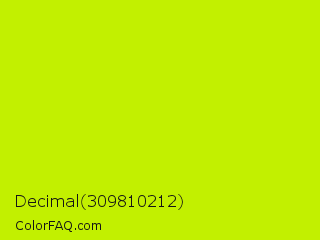 Decimal 309810212 Color is a normal lime color and the nearest color is Lime #bfff00. Hex code #c2f000 and RGB value is rgb(194,240,0). In RGB color space, this color is composed of 76% red, 94% green, 0% blue, In CMYK color space, this color is composed of 19% cyan, 0% magenta, 100% yellow , 6% black , In HSL color space, this color has a hue angle of 72° , 100% saturation and 47% lightness.