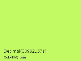 Decimal 309821571 Color is a light green color and the nearest color is Inchworm #b2ec5d. Hex code #c2fa63 and RGB value is rgb(194,250,99). In RGB color space, this color is composed of 76% red, 98% green, 39% blue, In CMYK color space, this color is composed of 22% cyan, 0% magenta, 60% yellow , 2% black , In HSL color space, this color has a hue angle of 82° , 94% saturation and 68% lightness.