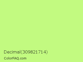 Decimal 309821714 Color is a light green color and the nearest color is Sulu #c1f07c. Hex code #c2fa80 and RGB value is rgb(194,250,128). In RGB color space, this color is composed of 76% red, 98% green, 50% blue, In CMYK color space, this color is composed of 22% cyan, 0% magenta, 49% yellow , 2% black , In HSL color space, this color has a hue angle of 88° , 92% saturation and 74% lightness.