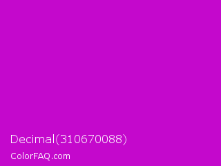Decimal 310670088 Color is a normal magenta color and the nearest color is Deep Magenta #cc00cc. Hex code #c408cc and RGB value is rgb(196,8,204). In RGB color space, this color is composed of 77% red, 3% green, 80% blue, In CMYK color space, this color is composed of 4% cyan, 96% magenta, 0% yellow , 20% black , In HSL color space, this color has a hue angle of 298° , 92% saturation and 42% lightness.