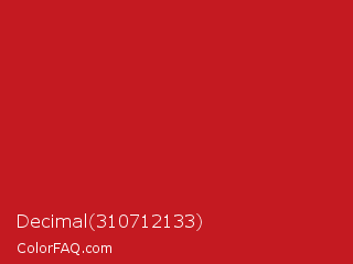 Decimal 310712133 Color is a normal red color and the nearest color is Fire Engine Red #ce2029. Hex code #c41a21 and RGB value is rgb(196,26,33). In RGB color space, this color is composed of 77% red, 10% green, 13% blue, In CMYK color space, this color is composed of 0% cyan, 87% magenta, 83% yellow , 23% black , In HSL color space, this color has a hue angle of 358° , 77% saturation and 44% lightness.