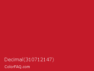 Decimal 310712147 Color is a normal red color and the nearest color is Fire Engine Red #ce2029. Hex code #c41a29 and RGB value is rgb(196,26,41). In RGB color space, this color is composed of 77% red, 10% green, 16% blue, In CMYK color space, this color is composed of 0% cyan, 87% magenta, 79% yellow , 23% black , In HSL color space, this color has a hue angle of 355° , 77% saturation and 44% lightness.