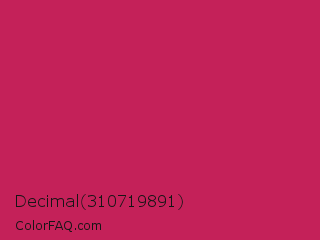 Decimal 310719891 Color is a normal rose color and the nearest color is Rose Red #c21e56. Hex code #c42159 and RGB value is rgb(196,33,89). In RGB color space, this color is composed of 77% red, 13% green, 35% blue, In CMYK color space, this color is composed of 0% cyan, 83% magenta, 55% yellow , 23% black , In HSL color space, this color has a hue angle of 339° , 71% saturation and 45% lightness.