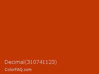 Decimal 310741123 Color is a normal orange color and the nearest color is Mahogany #c04000. Hex code #c43603 and RGB value is rgb(196,54,3). In RGB color space, this color is composed of 77% red, 21% green, 1% blue, In CMYK color space, this color is composed of 0% cyan, 72% magenta, 98% yellow , 23% black , In HSL color space, this color has a hue angle of 16° , 97% saturation and 39% lightness.
