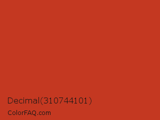 Decimal 310744101 Color is a normal red color and the nearest color is Dark Pastel Red #c23b22. Hex code #c43821 and RGB value is rgb(196,56,33). In RGB color space, this color is composed of 77% red, 22% green, 13% blue, In CMYK color space, this color is composed of 0% cyan, 71% magenta, 83% yellow , 23% black , In HSL color space, this color has a hue angle of 8° , 71% saturation and 45% lightness.