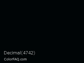 Decimal 4742 Color is a almost black cyan color and the nearest color is Rich Black FOGRA39 #010203. Hex code #000506 and RGB value is rgb(0,5,6). In RGB color space, this color is composed of 0% red, 2% green, 2% blue, In CMYK color space, this color is composed of 100% cyan, 17% magenta, 0% yellow , 98% black , In HSL color space, this color has a hue angle of 190° , 100% saturation and 1% lightness.