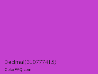 Decimal 310777415 Color is a normal magenta color and the nearest color is Steel Pink #cc33cc. Hex code #c440cf and RGB value is rgb(196,64,207). In RGB color space, this color is composed of 77% red, 25% green, 81% blue, In CMYK color space, this color is composed of 5% cyan, 69% magenta, 0% yellow , 19% black , In HSL color space, this color has a hue angle of 295° , 60% saturation and 53% lightness.