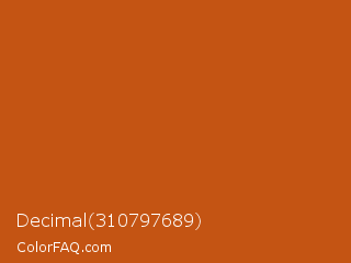 Decimal 310797689 Color is a normal orange color and the nearest color is Orange Roughy #c45719. Hex code #c45413 and RGB value is rgb(196,84,19). In RGB color space, this color is composed of 77% red, 33% green, 7% blue, In CMYK color space, this color is composed of 0% cyan, 57% magenta, 90% yellow , 23% black , In HSL color space, this color has a hue angle of 22° , 82% saturation and 42% lightness.
