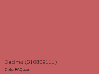 Decimal 310809111 Color is a normal red color and the nearest color is Chestnut Rose #cd5c5c. Hex code #c45e61 and RGB value is rgb(196,94,97). In RGB color space, this color is composed of 77% red, 37% green, 38% blue, In CMYK color space, this color is composed of 0% cyan, 52% magenta, 51% yellow , 23% black , In HSL color space, this color has a hue angle of 358° , 46% saturation and 57% lightness.
