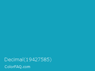 Decimal 19427585 Color is a normal cyan color and the nearest color is Blue Green #0d98ba. Hex code #13a3bd and RGB value is rgb(19,163,189). In RGB color space, this color is composed of 7% red, 64% green, 74% blue, In CMYK color space, this color is composed of 90% cyan, 14% magenta, 0% yellow , 26% black , In HSL color space, this color has a hue angle of 189° , 82% saturation and 41% lightness.