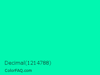 Decimal 1214788 Color is a normal green color and the nearest color is Medium Spring Green #00fa9a. Hex code #01f7b0 and RGB value is rgb(1,247,176). In RGB color space, this color is composed of 0% red, 97% green, 69% blue, In CMYK color space, this color is composed of 100% cyan, 0% magenta, 29% yellow , 3% black , In HSL color space, this color has a hue angle of 163° , 99% saturation and 49% lightness.