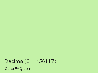 Decimal 311456117 Color is a light green color and the nearest color is Reef #c9ffa2. Hex code #c4f2a7 and RGB value is rgb(196,242,167). In RGB color space, this color is composed of 77% red, 95% green, 65% blue, In CMYK color space, this color is composed of 19% cyan, 0% magenta, 31% yellow , 5% black , In HSL color space, this color has a hue angle of 97° , 74% saturation and 80% lightness.