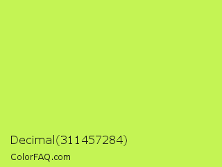 Decimal 311457284 Color is a light lime color and the nearest color is Inchworm #b2ec5d. Hex code #c4f454 and RGB value is rgb(196,244,84). In RGB color space, this color is composed of 77% red, 96% green, 33% blue, In CMYK color space, this color is composed of 20% cyan, 0% magenta, 66% yellow , 4% black , In HSL color space, this color has a hue angle of 78° , 88% saturation and 64% lightness.