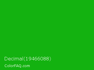 Decimal 19466088 Color is a normal green color and the nearest color is Slimy Green #299617. Hex code #13b210 and RGB value is rgb(19,178,16). In RGB color space, this color is composed of 7% red, 70% green, 6% blue, In CMYK color space, this color is composed of 89% cyan, 0% magenta, 91% yellow , 30% black , In HSL color space, this color has a hue angle of 119° , 84% saturation and 38% lightness.