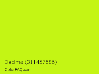 Decimal 311457686 Color is a normal lime color and the nearest color is Arctic Lime #d0ff14. Hex code #c4f514 and RGB value is rgb(196,245,20). In RGB color space, this color is composed of 77% red, 96% green, 8% blue, In CMYK color space, this color is composed of 20% cyan, 0% magenta, 92% yellow , 4% black , In HSL color space, this color has a hue angle of 73° , 92% saturation and 52% lightness.