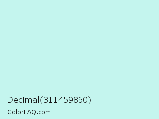 Decimal 311459860 Color is a very light cyan color and the nearest color is Mint Tulip #c4f4eb. Hex code #c4f5ee and RGB value is rgb(196,245,238). In RGB color space, this color is composed of 77% red, 96% green, 93% blue, In CMYK color space, this color is composed of 20% cyan, 0% magenta, 3% yellow , 4% black , In HSL color space, this color has a hue angle of 171° , 71% saturation and 86% lightness.
