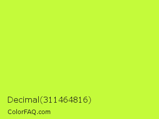 Decimal 311464816 Color is a light lime color and the nearest color is Green Yellow #adff2f. Hex code #c4fb3a and RGB value is rgb(196,251,58). In RGB color space, this color is composed of 77% red, 98% green, 23% blue, In CMYK color space, this color is composed of 22% cyan, 0% magenta, 77% yellow , 2% black , In HSL color space, this color has a hue angle of 77° , 96% saturation and 61% lightness.