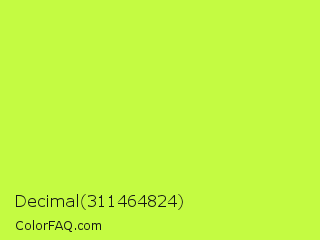Decimal 311464824 Color is a light lime color and the nearest color is Green Yellow #adff2f. Hex code #c4fb42 and RGB value is rgb(196,251,66). In RGB color space, this color is composed of 77% red, 98% green, 26% blue, In CMYK color space, this color is composed of 22% cyan, 0% magenta, 74% yellow , 2% black , In HSL color space, this color has a hue angle of 78° , 96% saturation and 62% lightness.