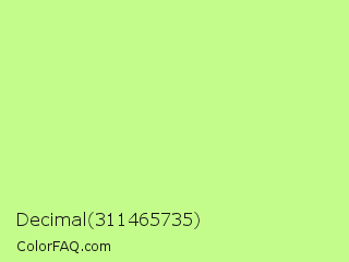 Decimal 311465735 Color is a light green color and the nearest color is Sulu #c1f07c. Hex code #c4fc8b and RGB value is rgb(196,252,139). In RGB color space, this color is composed of 77% red, 99% green, 55% blue, In CMYK color space, this color is composed of 22% cyan, 0% magenta, 45% yellow , 1% black , In HSL color space, this color has a hue angle of 90° , 95% saturation and 77% lightness.