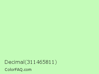 Decimal 311465811 Color is a very light green color and the nearest color is Gossip #d2f8b0. Hex code #c4fcb9 and RGB value is rgb(196,252,185). In RGB color space, this color is composed of 77% red, 99% green, 73% blue, In CMYK color space, this color is composed of 22% cyan, 0% magenta, 27% yellow , 1% black , In HSL color space, this color has a hue angle of 110° , 92% saturation and 86% lightness.