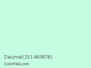 Decimal 311465878 Color is a very light green color and the nearest color is Aero Blue #c9ffe5. Hex code #c4fce4 and RGB value is rgb(196,252,228). In RGB color space, this color is composed of 77% red, 99% green, 89% blue, In CMYK color space, this color is composed of 22% cyan, 0% magenta, 10% yellow , 1% black , In HSL color space, this color has a hue angle of 154° , 90% saturation and 88% lightness.