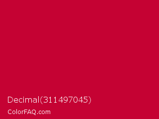 Decimal 311497045 Color is a normal red color and the nearest color is Red NCS #c40233. Hex code #c50233 and RGB value is rgb(197,2,51). In RGB color space, this color is composed of 77% red, 1% green, 20% blue, In CMYK color space, this color is composed of 0% cyan, 99% magenta, 74% yellow , 23% black , In HSL color space, this color has a hue angle of 345° , 98% saturation and 39% lightness.