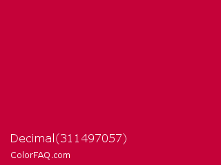 Decimal 311497057 Color is a normal rose color and the nearest color is Red NCS #c40233. Hex code #c50239 and RGB value is rgb(197,2,57). In RGB color space, this color is composed of 77% red, 1% green, 22% blue, In CMYK color space, this color is composed of 0% cyan, 99% magenta, 71% yellow , 23% black , In HSL color space, this color has a hue angle of 343° , 98% saturation and 39% lightness.