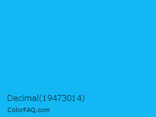 Decimal 19473014 Color is a normal blue color and the nearest color is Spiro Disco Ball #0fc0fc. Hex code #13b7f4 and RGB value is rgb(19,183,244). In RGB color space, this color is composed of 7% red, 72% green, 96% blue, In CMYK color space, this color is composed of 92% cyan, 25% magenta, 0% yellow , 4% black , In HSL color space, this color has a hue angle of 196° , 91% saturation and 52% lightness.