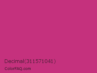 Decimal 311571041 Color is a normal rose color and the nearest color is Fuchsia Purple #cc397b. Hex code #c5317d and RGB value is rgb(197,49,125). In RGB color space, this color is composed of 77% red, 19% green, 49% blue, In CMYK color space, this color is composed of 0% cyan, 75% magenta, 37% yellow , 23% black , In HSL color space, this color has a hue angle of 329° , 60% saturation and 48% lightness.