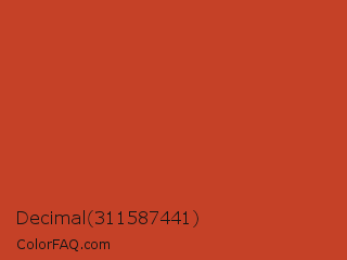 Decimal 311587441 Color is a normal red color and the nearest color is Dark Pastel Red #c23b22. Hex code #c54127 and RGB value is rgb(197,65,39). In RGB color space, this color is composed of 77% red, 25% green, 15% blue, In CMYK color space, this color is composed of 0% cyan, 67% magenta, 80% yellow , 23% black , In HSL color space, this color has a hue angle of 10° , 67% saturation and 46% lightness.