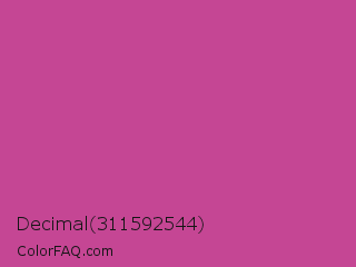 Decimal 311592544 Color is a normal magenta color and the nearest color is Mulberry #c54b8c. Hex code #c54694 and RGB value is rgb(197,70,148). In RGB color space, this color is composed of 77% red, 27% green, 58% blue, In CMYK color space, this color is composed of 0% cyan, 64% magenta, 25% yellow , 23% black , In HSL color space, this color has a hue angle of 323° , 52% saturation and 52% lightness.