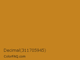 Decimal 311705945 Color is a normal orange color and the nearest color is Brandy Punch #cd8429. Hex code #c5831f and RGB value is rgb(197,131,31). In RGB color space, this color is composed of 77% red, 51% green, 12% blue, In CMYK color space, this color is composed of 0% cyan, 34% magenta, 84% yellow , 23% black , In HSL color space, this color has a hue angle of 36° , 73% saturation and 45% lightness.