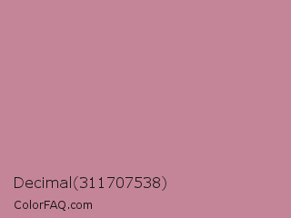 Decimal 311707538 Color is a light rose color and the nearest color is Puce #cc8899. Hex code #c58598 and RGB value is rgb(197,133,152). In RGB color space, this color is composed of 77% red, 52% green, 60% blue, In CMYK color space, this color is composed of 0% cyan, 32% magenta, 23% yellow , 23% black , In HSL color space, this color has a hue angle of 342° , 36% saturation and 65% lightness.