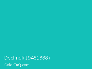 Decimal 19481888 Color is a normal cyan color and the nearest color is Tiffany Blue #0abab5. Hex code #13c0b8 and RGB value is rgb(19,192,184). In RGB color space, this color is composed of 7% red, 75% green, 72% blue, In CMYK color space, this color is composed of 90% cyan, 0% magenta, 4% yellow , 25% black , In HSL color space, this color has a hue angle of 177° , 82% saturation and 41% lightness.