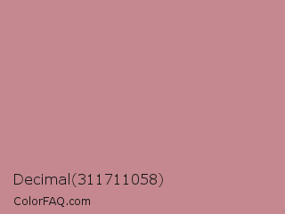 Decimal 311711058 Color is a light red color and the nearest color is Oriental Pink #c69191. Hex code #c58890 and RGB value is rgb(197,136,144). In RGB color space, this color is composed of 77% red, 53% green, 56% blue, In CMYK color space, this color is composed of 0% cyan, 31% magenta, 27% yellow , 23% black , In HSL color space, this color has a hue angle of 352° , 34% saturation and 65% lightness.