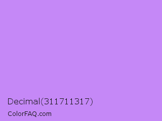 Decimal 311711317 Color is a light purple color and the nearest color is Pale Violet #cc99ff. Hex code #c588f7 and RGB value is rgb(197,136,247). In RGB color space, this color is composed of 77% red, 53% green, 97% blue, In CMYK color space, this color is composed of 20% cyan, 45% magenta, 0% yellow , 3% black , In HSL color space, this color has a hue angle of 273° , 87% saturation and 75% lightness.