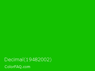 Decimal 19482002 Color is a normal green color and the nearest color is Islamic Green #009000. Hex code #13c100 and RGB value is rgb(19,193,0). In RGB color space, this color is composed of 7% red, 76% green, 0% blue, In CMYK color space, this color is composed of 90% cyan, 0% magenta, 100% yellow , 24% black , In HSL color space, this color has a hue angle of 114° , 100% saturation and 38% lightness.