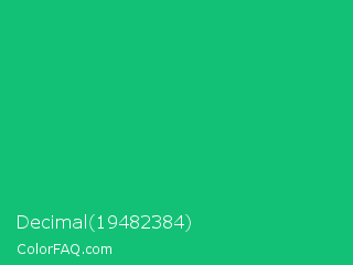 Decimal 19482384 Color is a normal green color and the nearest color is Mountain Meadow Crayola #1ab385. Hex code #13c176 and RGB value is rgb(19,193,118). In RGB color space, this color is composed of 7% red, 76% green, 46% blue, In CMYK color space, this color is composed of 90% cyan, 0% magenta, 39% yellow , 24% black , In HSL color space, this color has a hue angle of 154° , 82% saturation and 42% lightness.