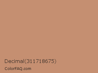 Decimal 311718675 Color is a light orange color and the nearest color is Antique Brass #cd9575. Hex code #c58f71 and RGB value is rgb(197,143,113). In RGB color space, this color is composed of 77% red, 56% green, 44% blue, In CMYK color space, this color is composed of 0% cyan, 27% magenta, 43% yellow , 23% black , In HSL color space, this color has a hue angle of 21° , 42% saturation and 61% lightness.