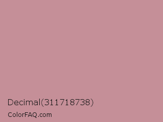 Decimal 311718738 Color is a light red color and the nearest color is Oriental Pink #c69191. Hex code #c58f98 and RGB value is rgb(197,143,152). In RGB color space, this color is composed of 77% red, 56% green, 60% blue, In CMYK color space, this color is composed of 0% cyan, 27% magenta, 23% yellow , 23% black , In HSL color space, this color has a hue angle of 350° , 32% saturation and 67% lightness.