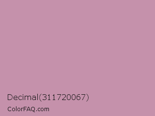 Decimal 311720067 Color is a light rose color and the nearest color is Viola #cb8fa9. Hex code #c591ab and RGB value is rgb(197,145,171). In RGB color space, this color is composed of 77% red, 57% green, 67% blue, In CMYK color space, this color is composed of 0% cyan, 26% magenta, 13% yellow , 23% black , In HSL color space, this color has a hue angle of 330° , 31% saturation and 67% lightness.